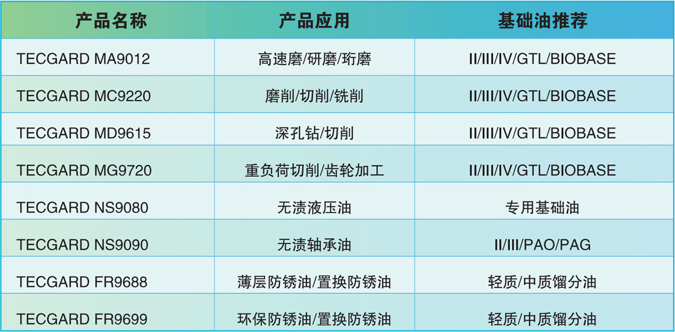 TECGARD系列金属加工复合剂,具有优异的润滑、抗磨、冷却、抗腐性能和负荷适应性,用户根据加工方式和剂型推荐,改变添加量和基础油黏度,可以轻松获得需要的性能,满足磨削、切削、重负荷加工、钻孔等多种加工方式对油品的要求。