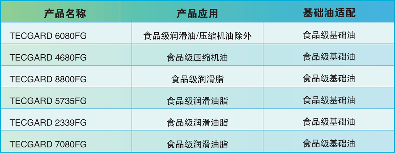 TECGARD FG食品级油脂复合添加剂-符合NSF HX-1标准。食品级润滑剂是指用于食品加工机械和食品包装机械,具有润滑、热传导、载荷传递、防腐蚀作用,并可能与食品、化妆品、药品或动物饲料接触的物质。